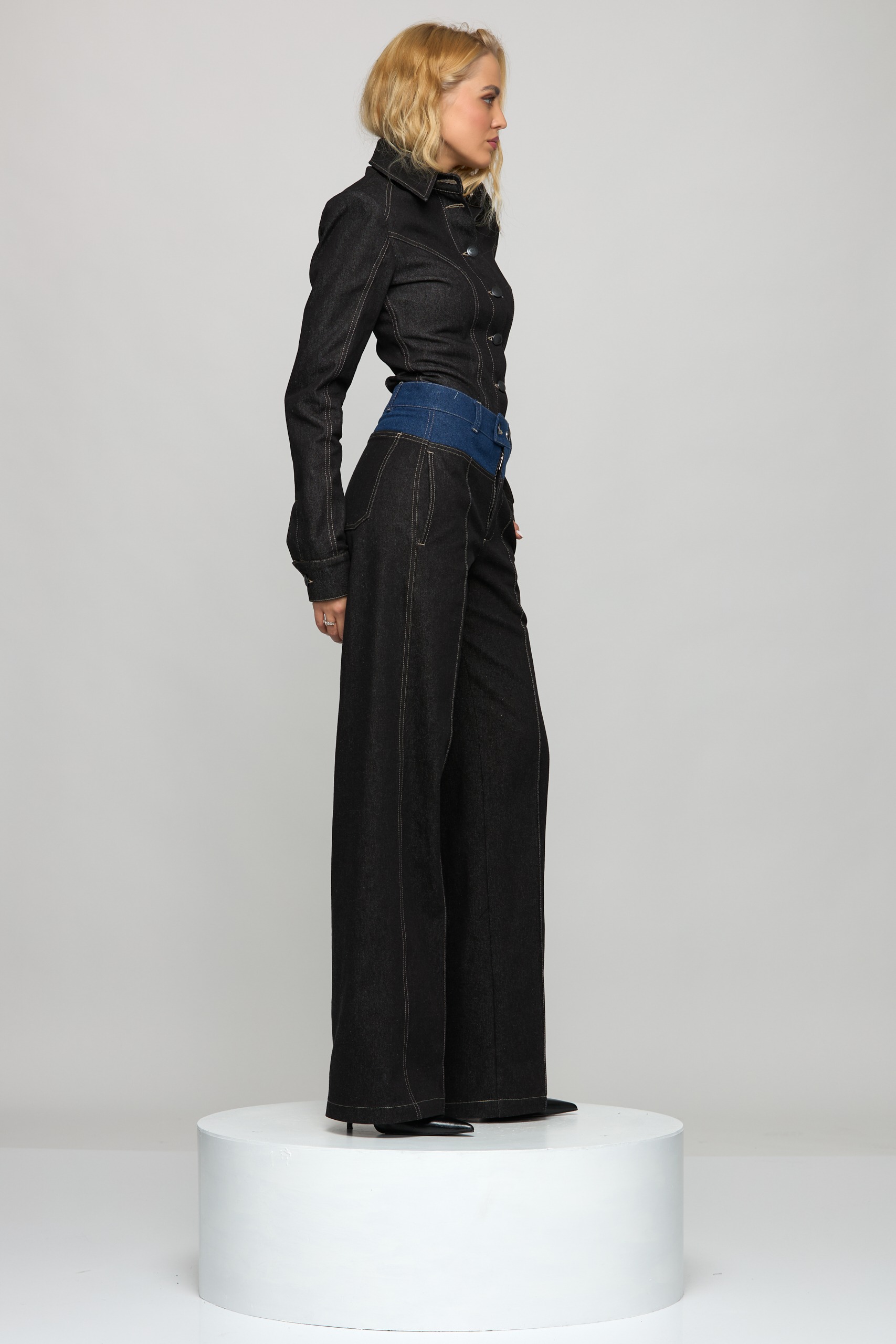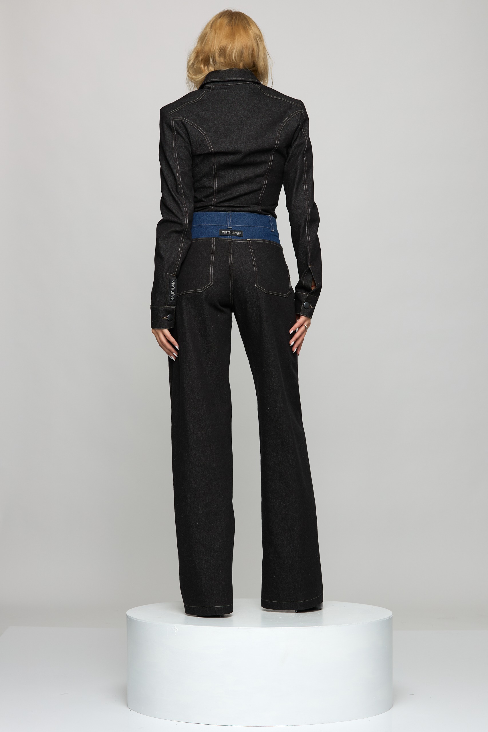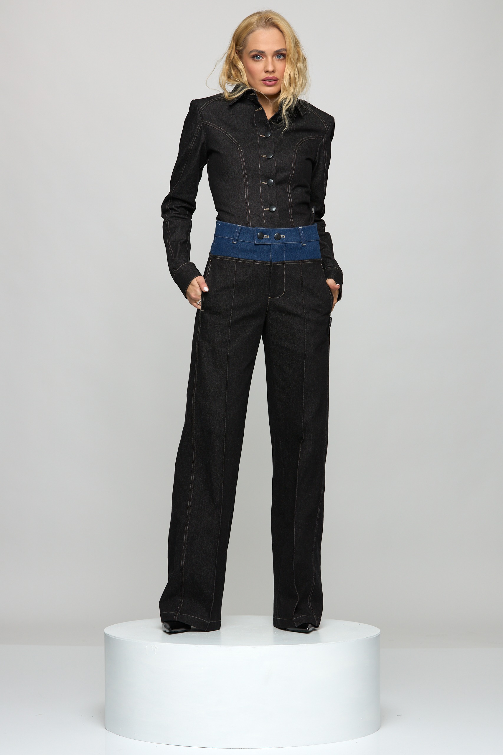 - Džinsinio audinio kelnės mėlynu juosmeniu