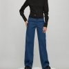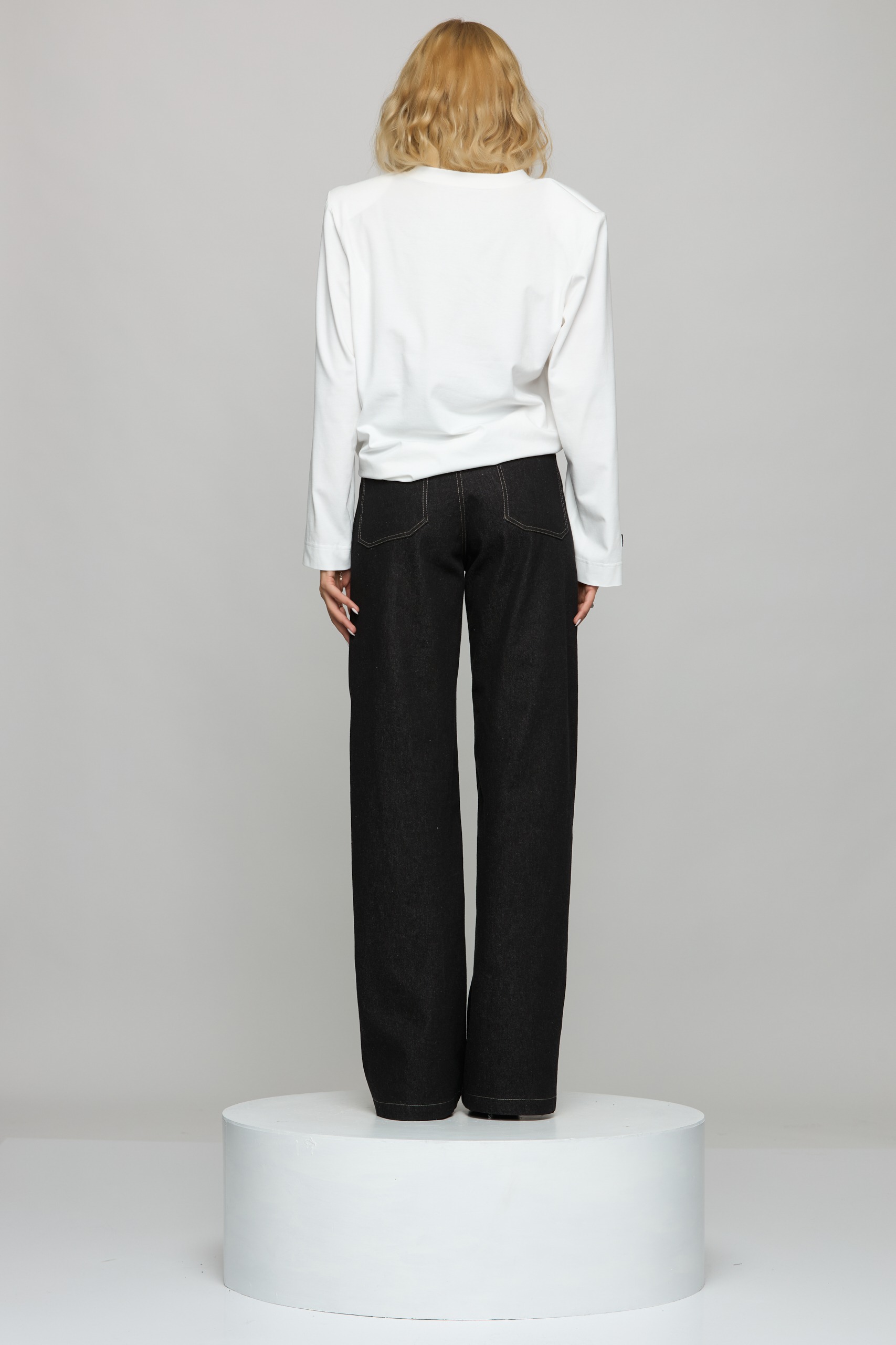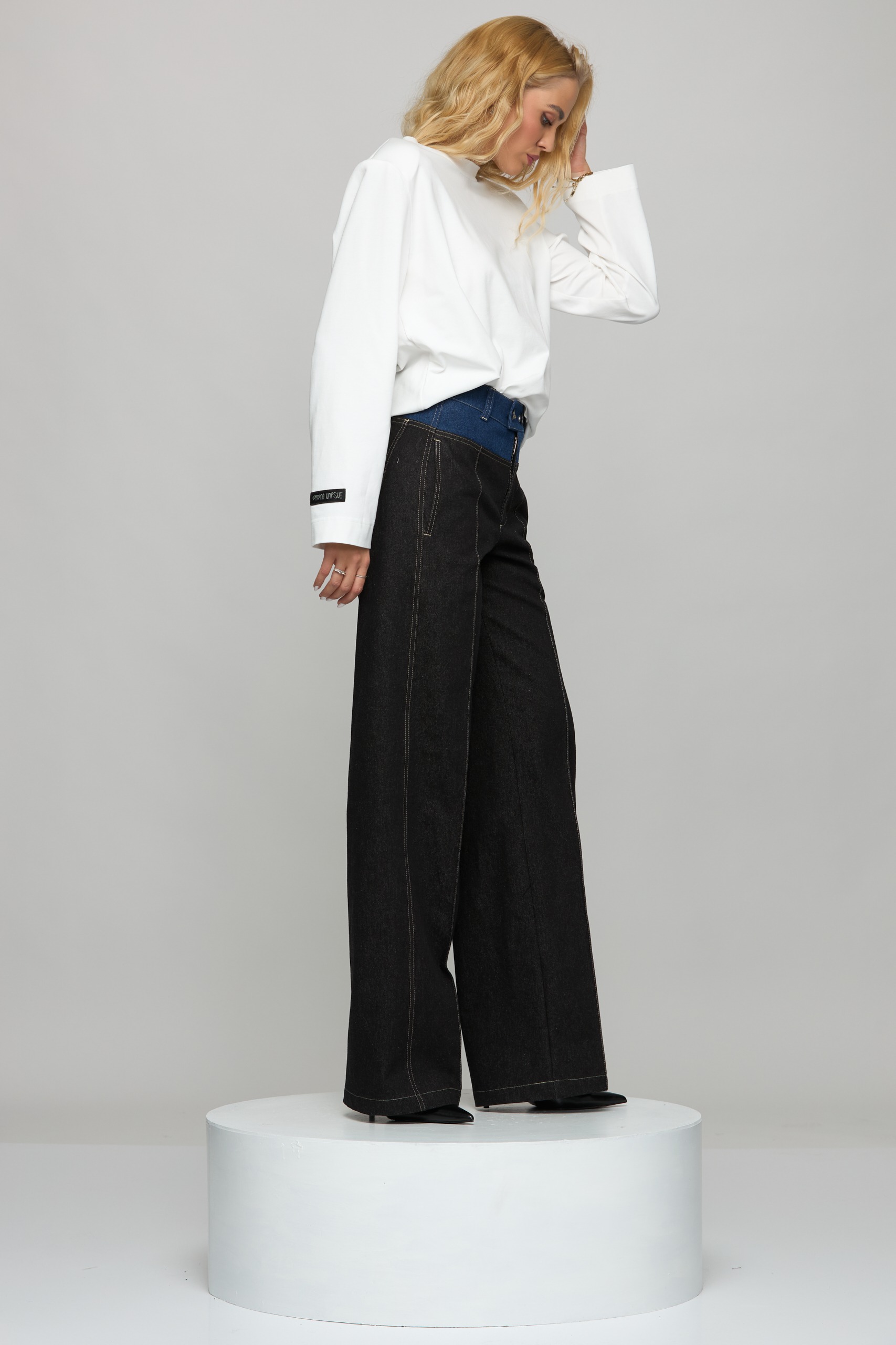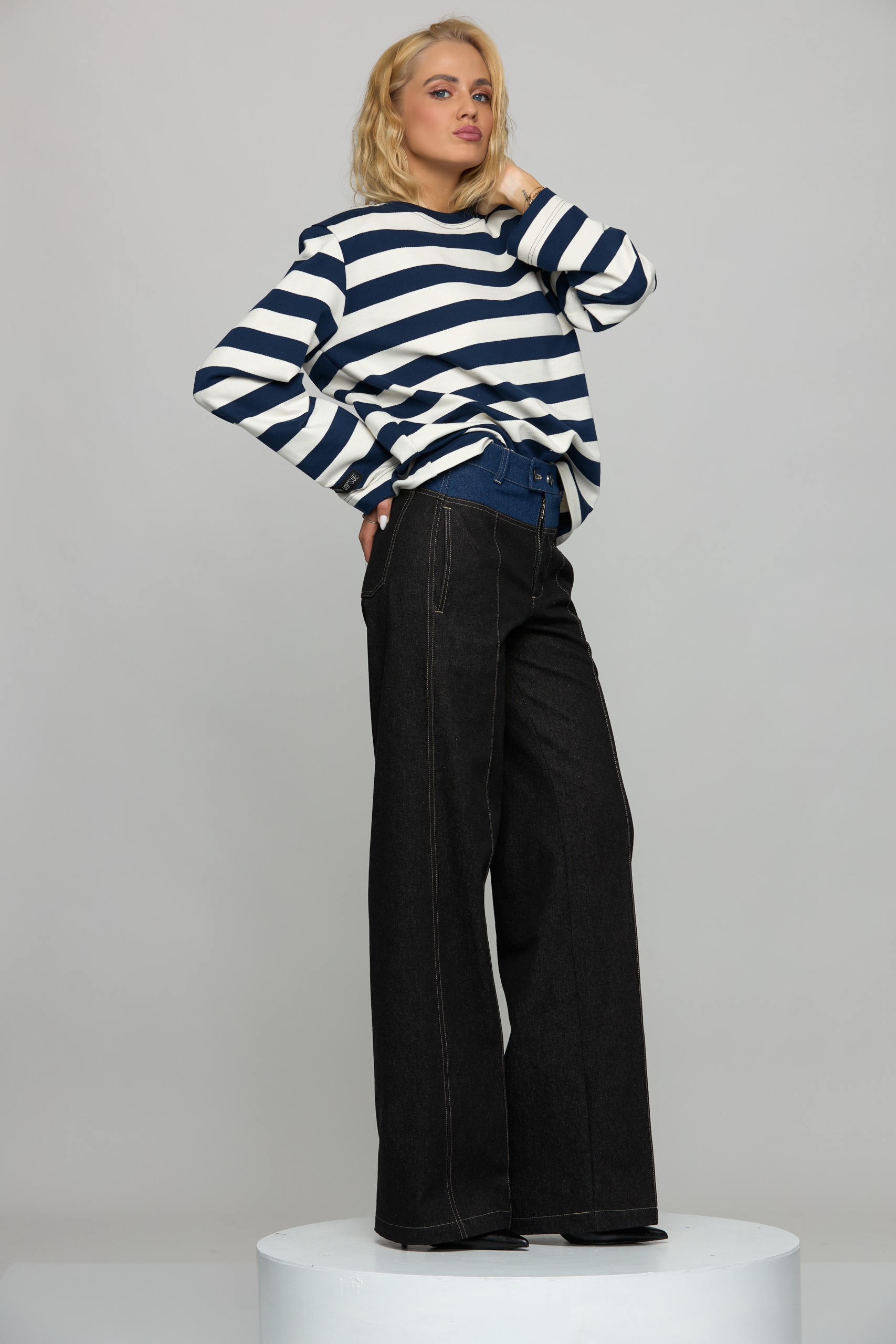 - Džinsinio audinio kelnės mėlynu juosmeniu
