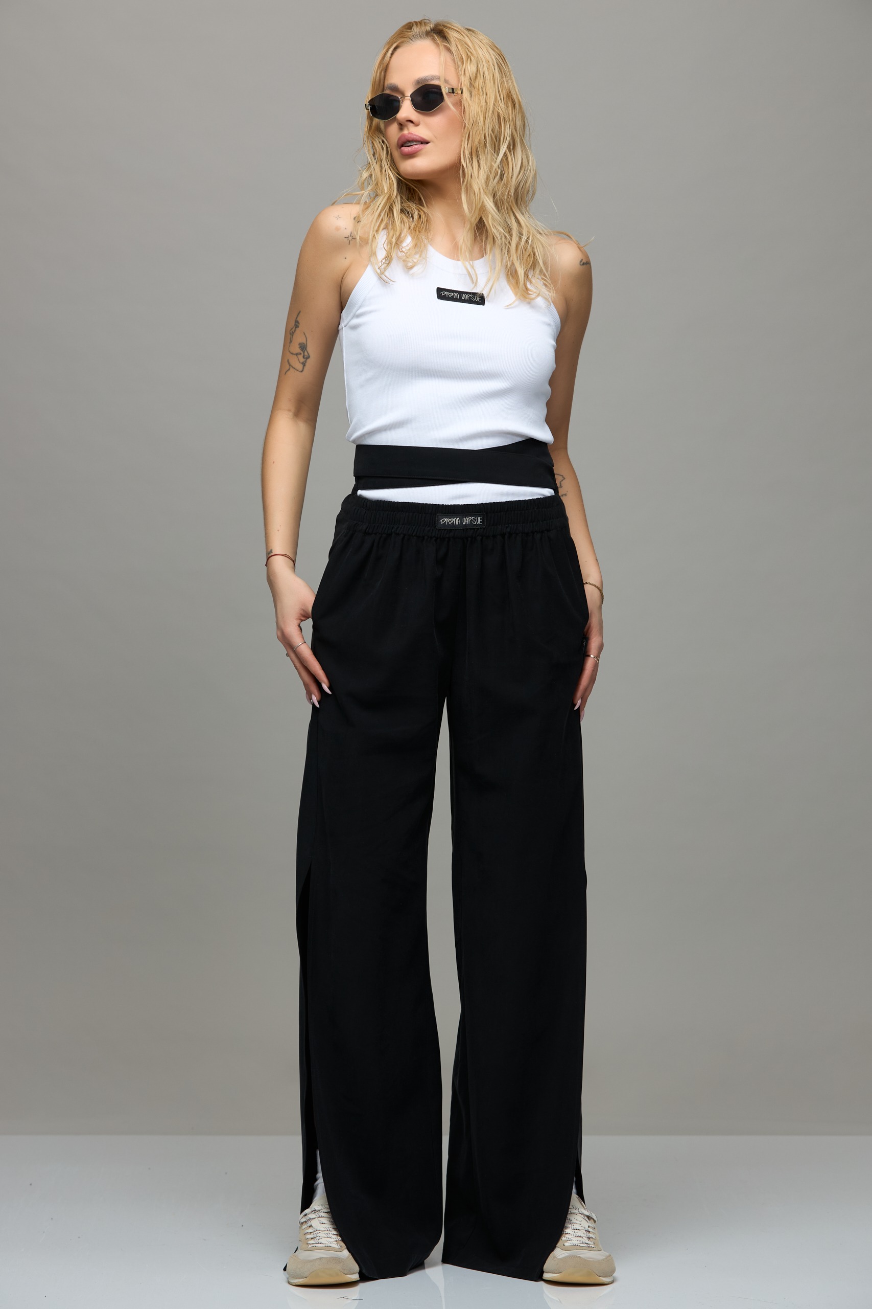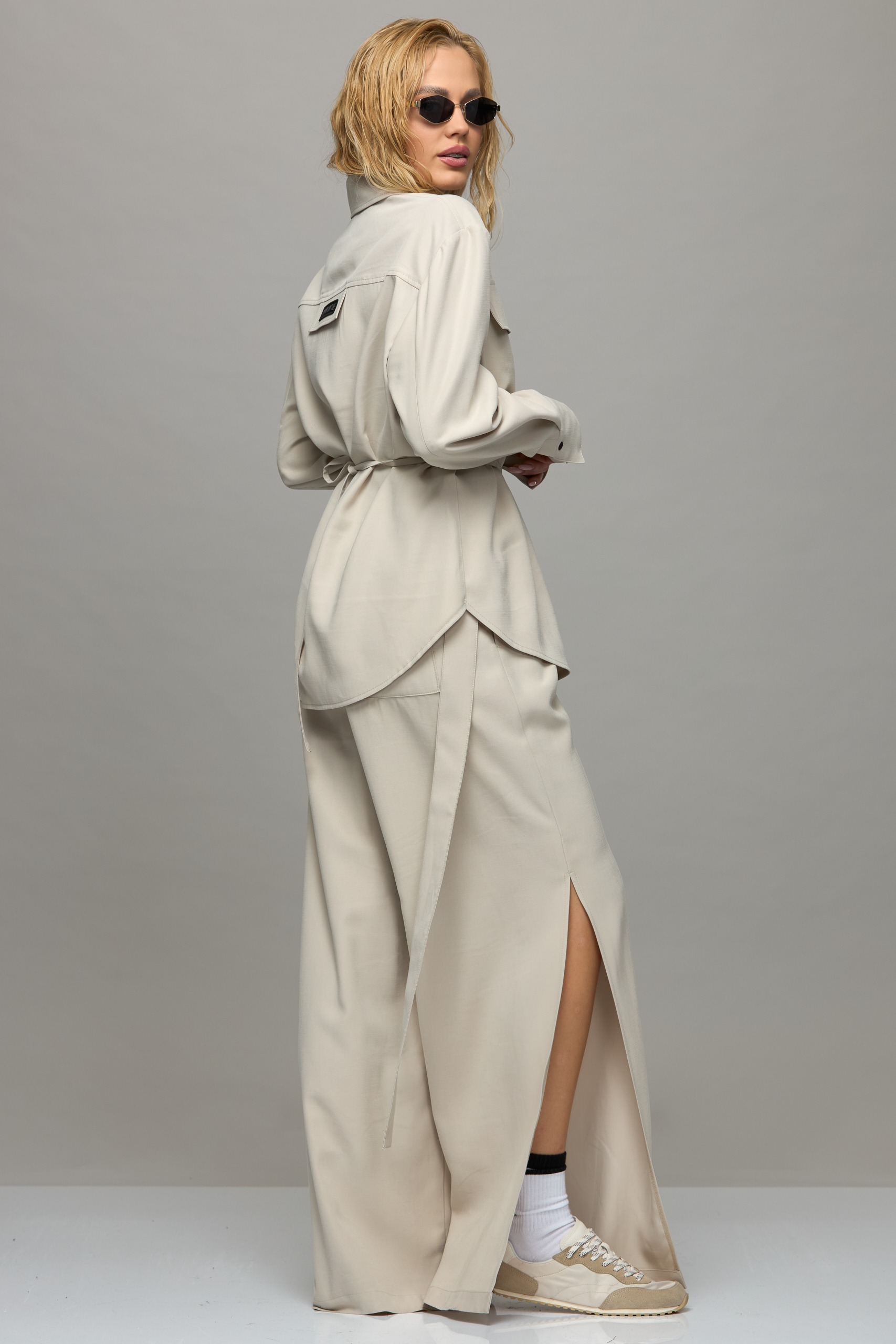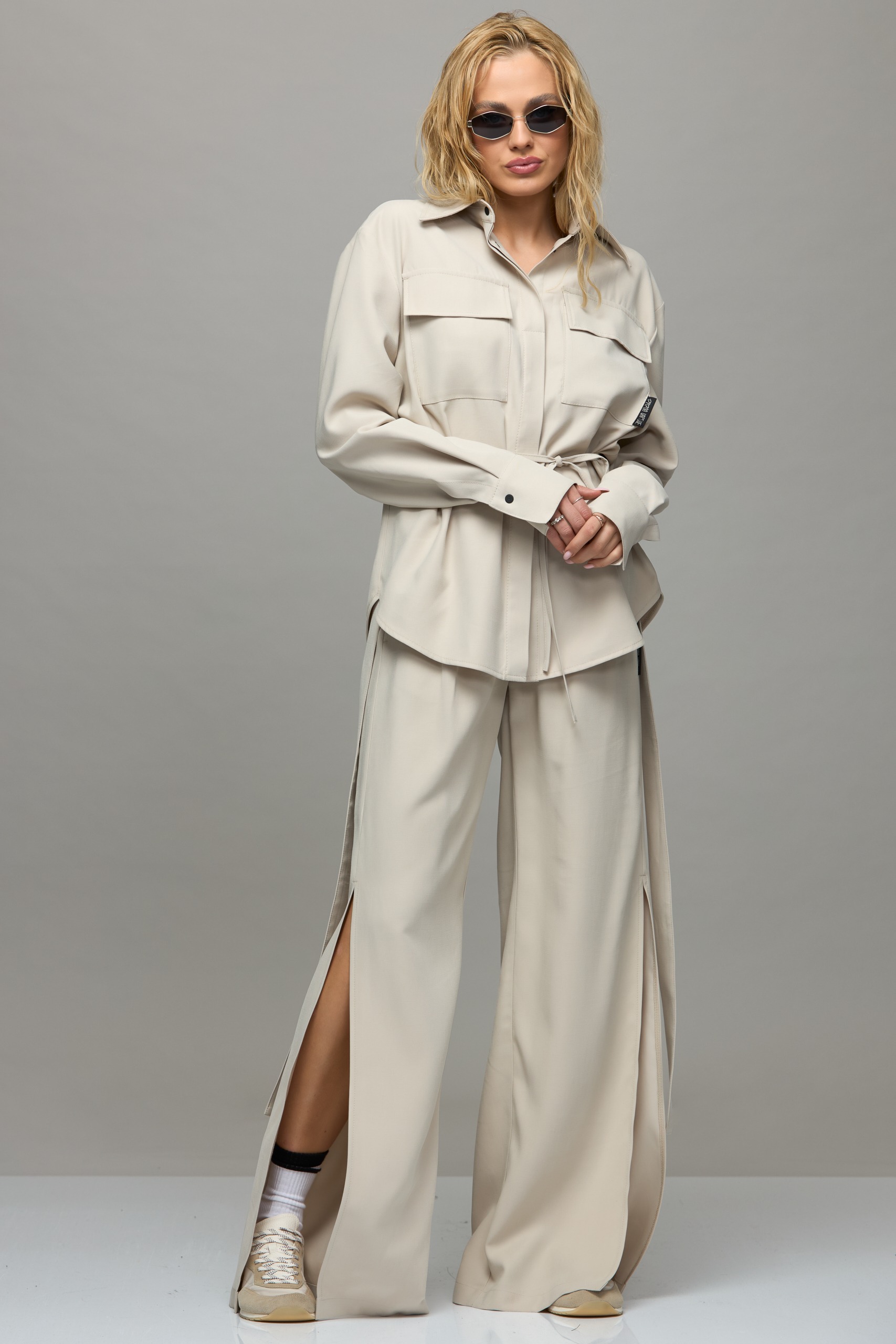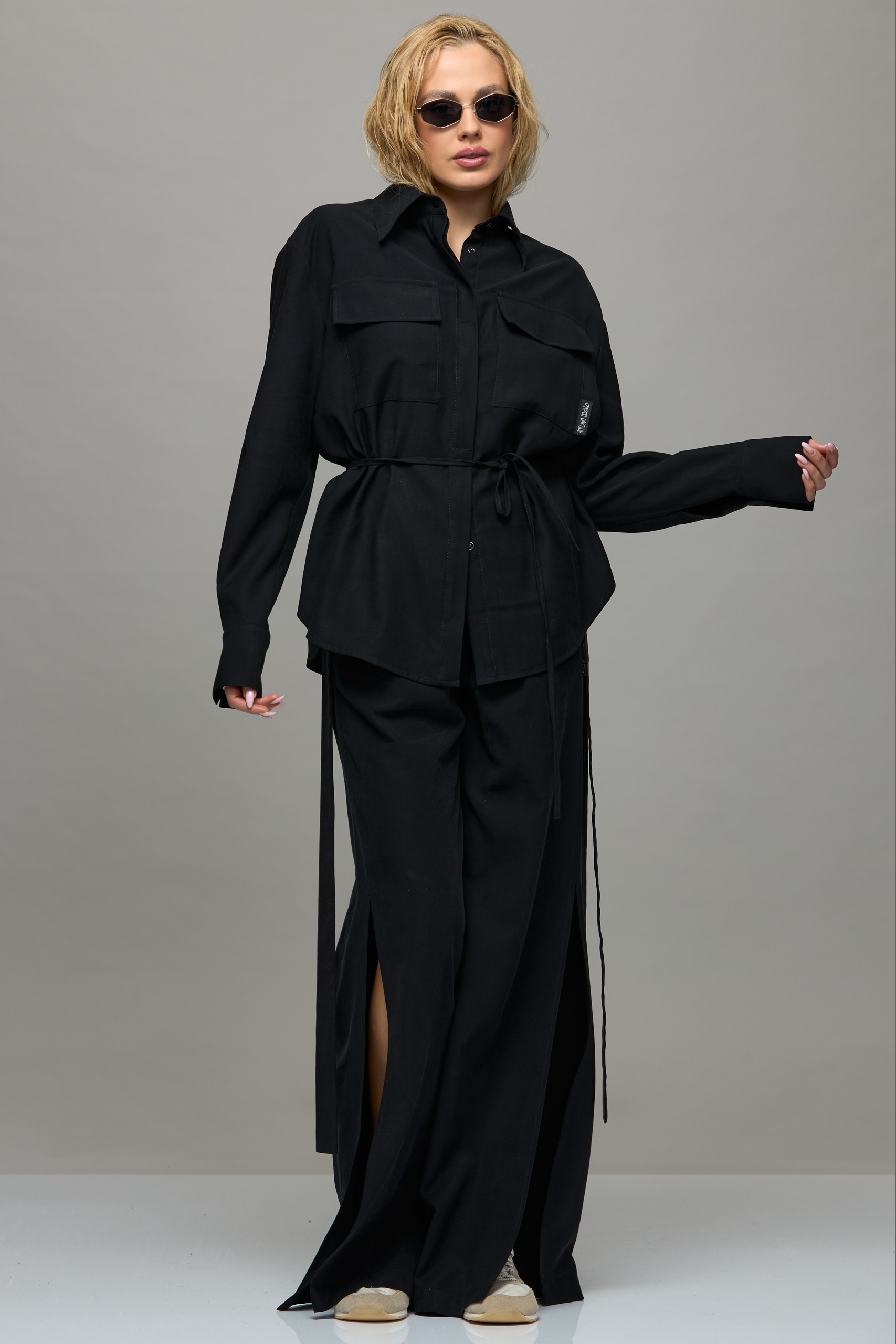- Kelnių juosmuo turi papildomą diržą, kurį galima apsisukti aplink juosmenį, tai suteikia kelnėms dvigubo juosmens siluetą