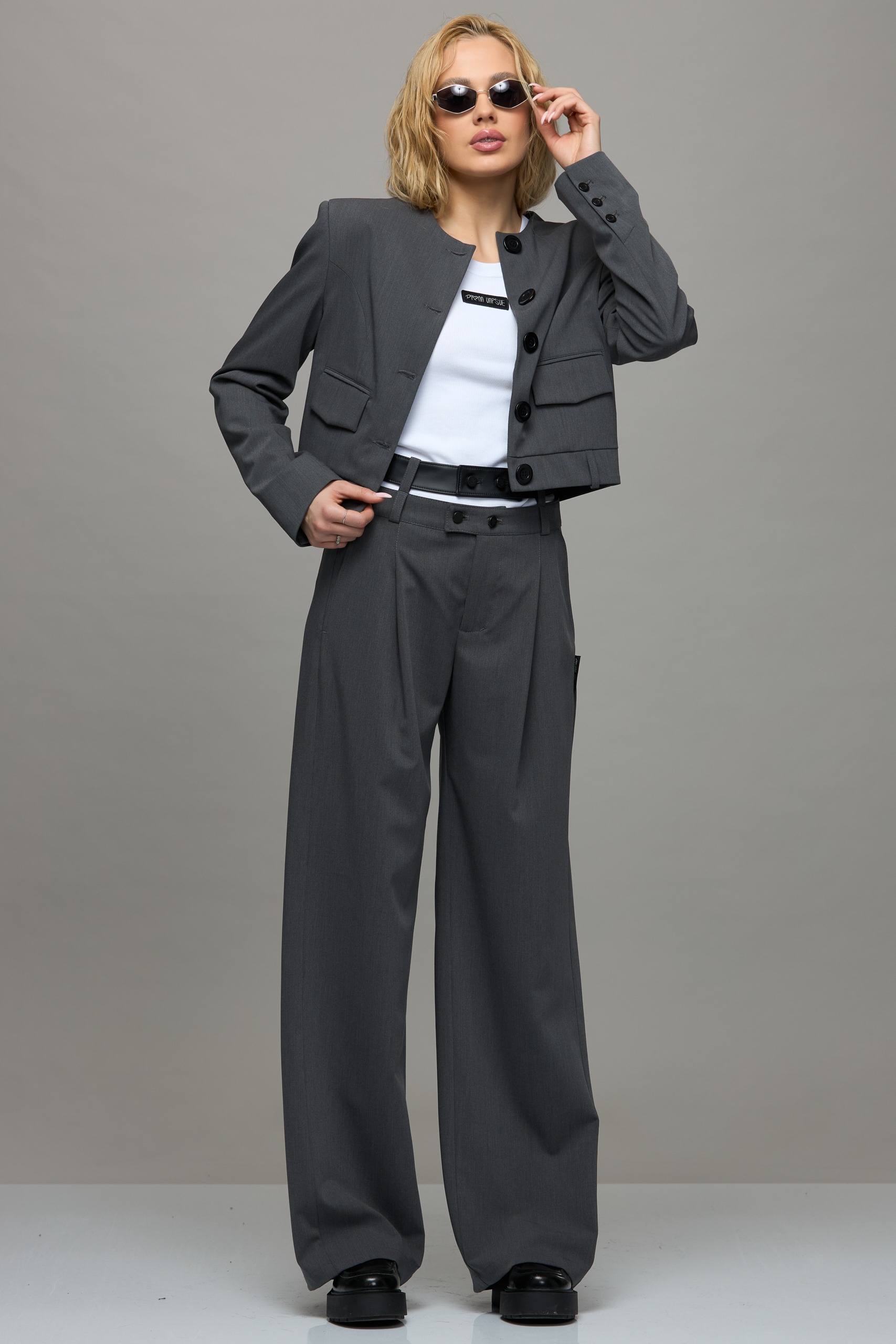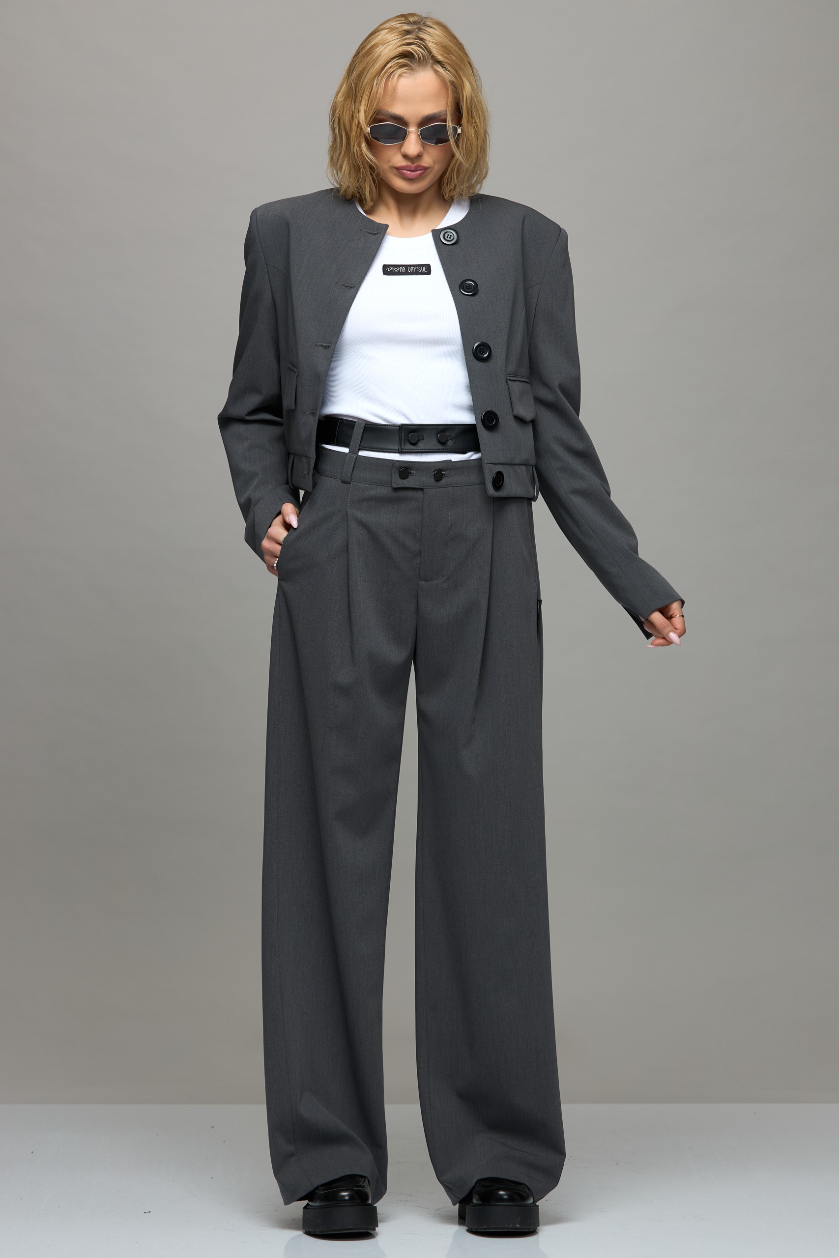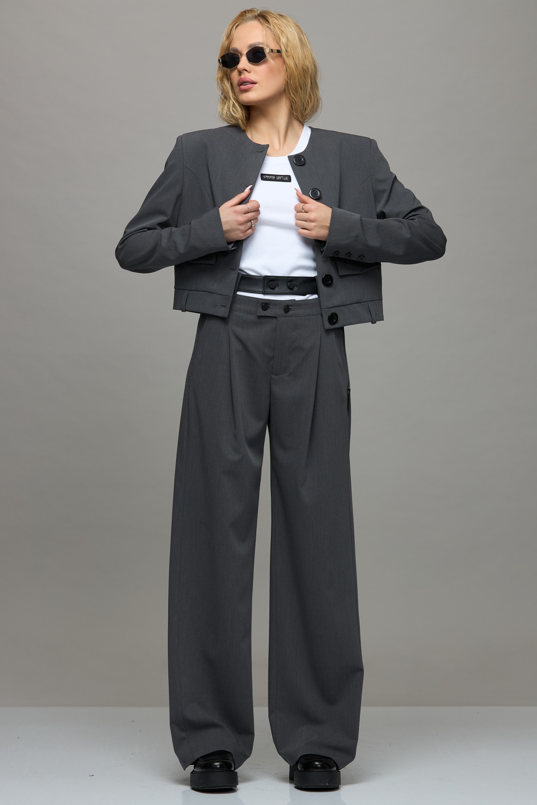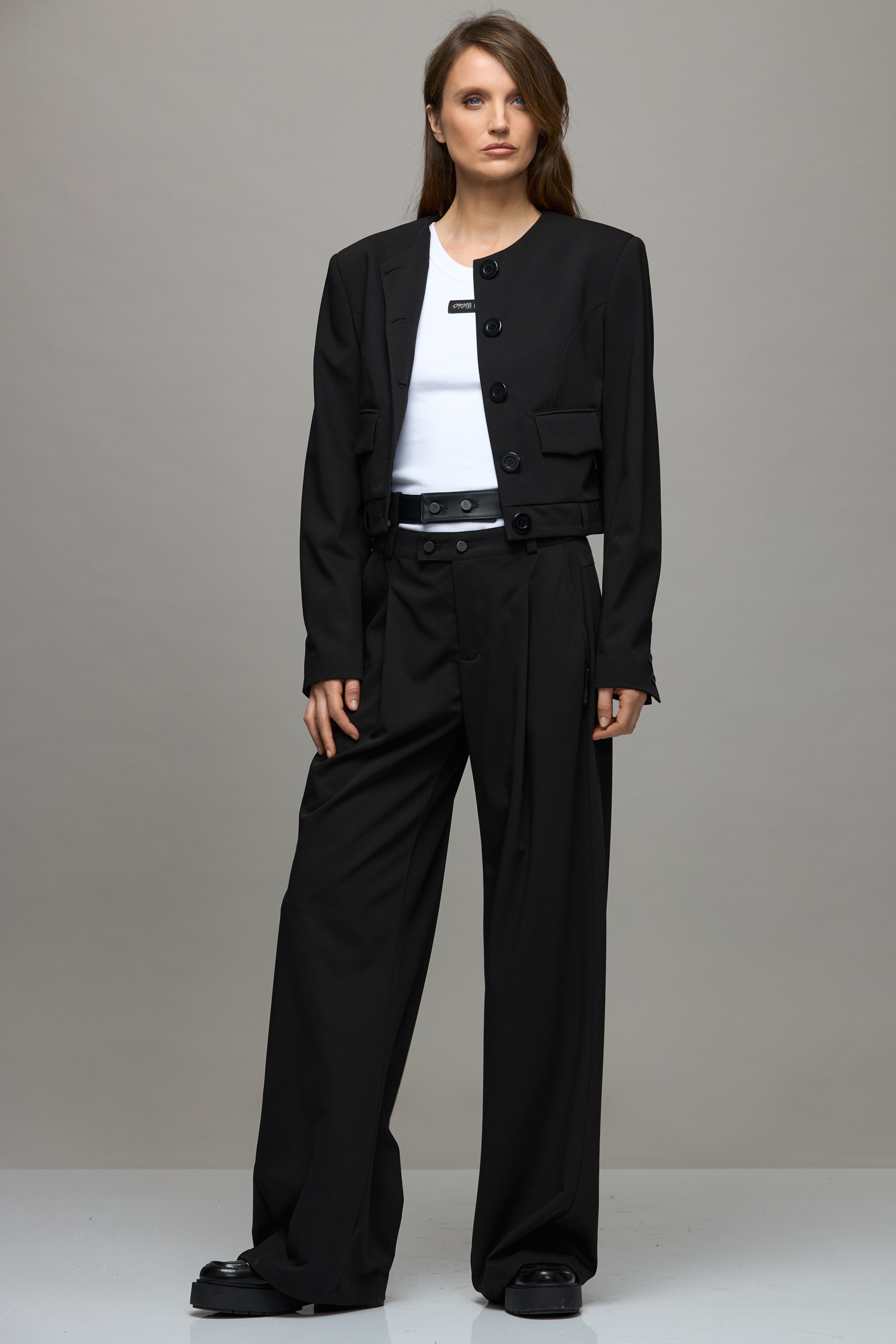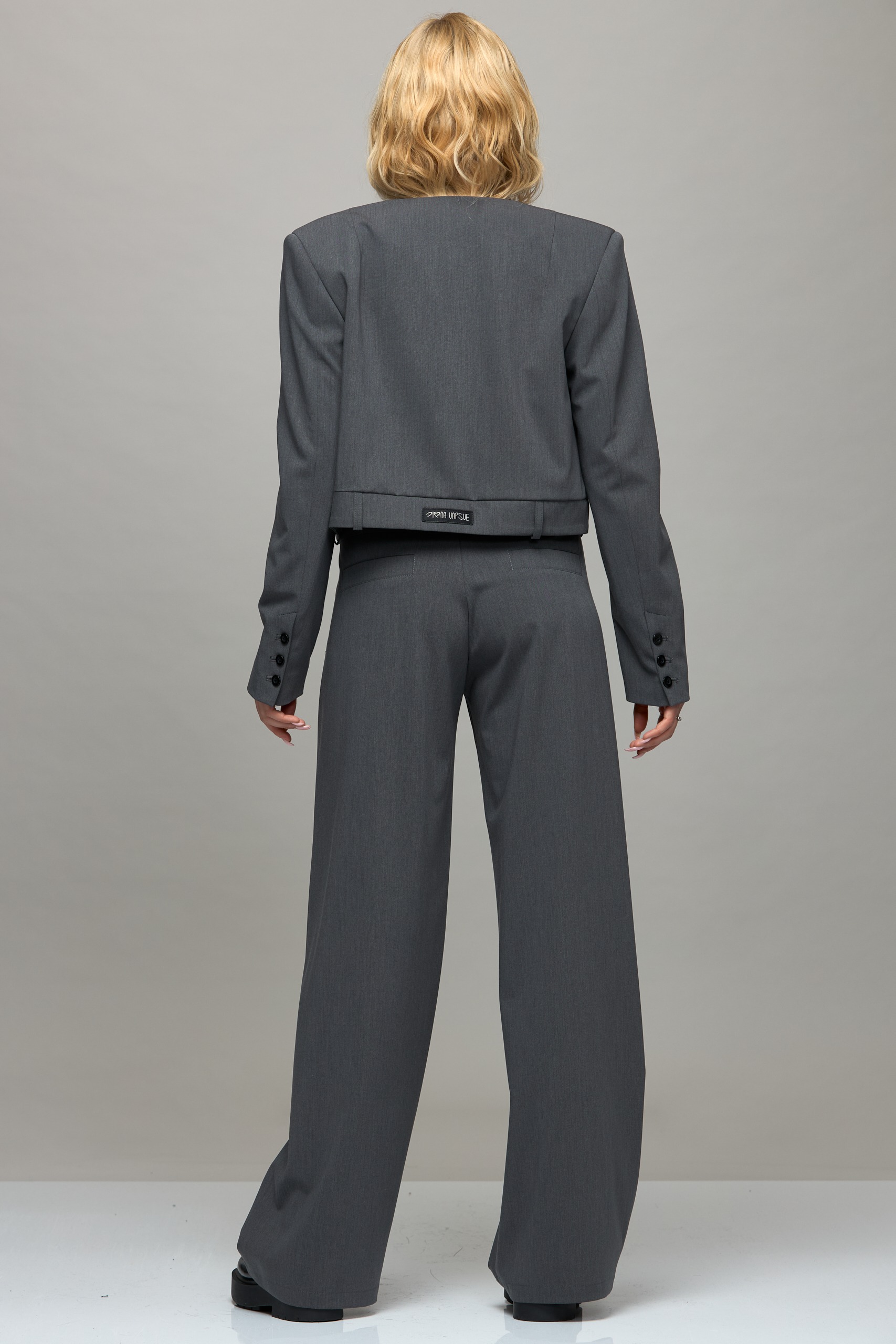 Viršutinio audinio sudėtis: 62% Poliesteris, 25% Viskozė, 8% Vilna, 5% Elastanas